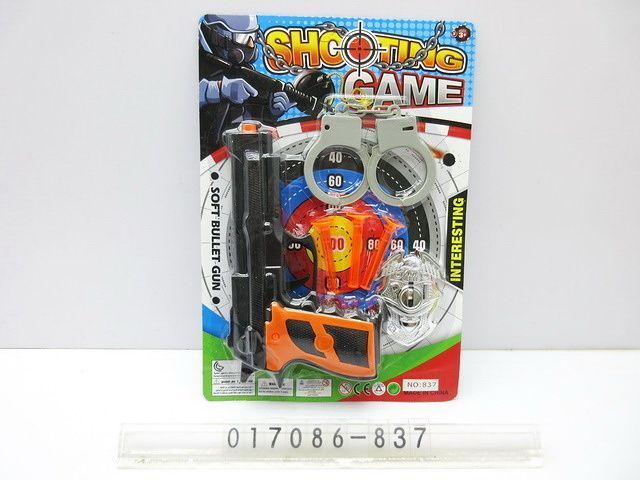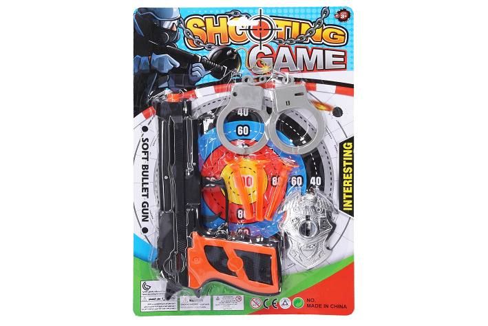 Policejní set. Velikost pistole 20,5 cm. Obsahuje pistoli, 3 náboje, odznak, pouta.