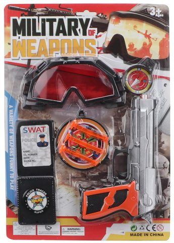 Policejní set. Obsahuje pistoli, 3 náboje, terč, kompas, brýle, průkaz.