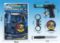 Policejní set s efekty. Velikost pistole 20 cm, nože 22 cm. Pistole se světelnými a zvukovými efekty. 2xAA baterie nejsou součástí. Balení obsahuje pistoli, nůž, pouta, terč.