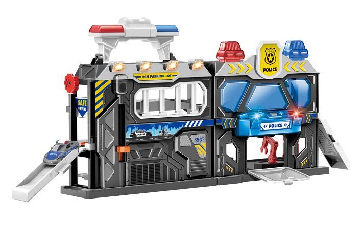 Policejní stanice přenosná. Rozměry 56x18x23 cm. Světelné a zvukové efekty. Aktivace tlačítkem na modrém panelu. 3xAG13 baterie součástí. Součástí 2 auta s volnými koly, mnoho příslušenství (dopravní značky, hasičský přístroj, myčka, čerpací stanice, diagnostika a další).