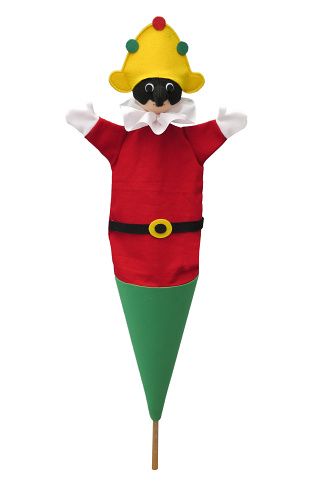 Kornoutový maňásek "3v1" = loutka+maňásek+schránka na drobnosti. Ovládá se dřevěnou tyčkou, kterou také schováte celou postavičku do kornoutu. Otvorem na zádech ovládáte ruce, tak jako u maňásků, nebo vložíte drobné dárky do kornoutu.