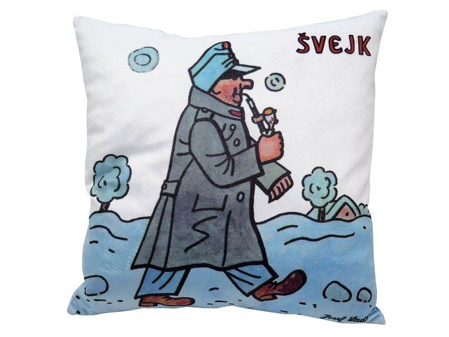 Měkký polštář s motivem dobrého vojáka Švejka od Josefa Lady, vhodný na cesty i jako dekorace. Materiál mikrovelur, obrázek tisk, náplň duté vlákno. Pratelný.