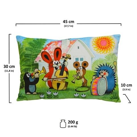Měkoučký polštářek s motivem oblíbeného Krtečka, vhodný do postýlky, na cesty i jako dekorace do pokojíčku. Materiál mikrovelur, obrázek tisk, náplň duté vlákno. Zadní strana žlutozelená.
