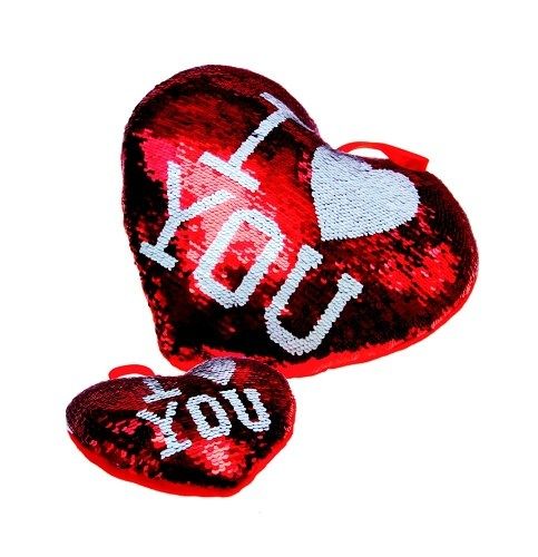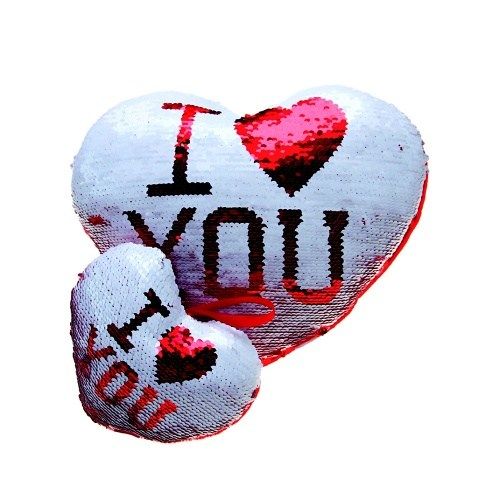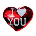 Polštář ve tvaru srdce s flitry o velikosti 30 cm. Polštář má na sobě nápis I love you. Vhodný pro děti od 3 let.