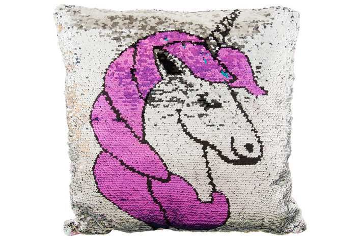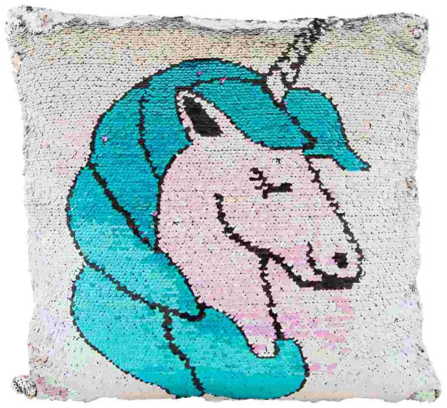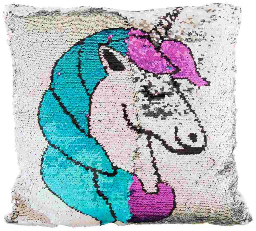 Polštářek s flitrami (překlápěcí efekt) v designu Jednorožec. Velikost polštářku 38×38 cm.
