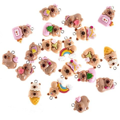 Tento okouzlující, průhledný mini kufřík naplněný dvaceti hravými, pastelově zbarvenými pryskyřičnými přívěsky ve tvaru kapybary s plochým dnem je perfektním dárkem pro děti nebo dekorativním prvkem pro scrapbooking.
