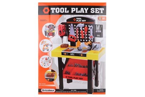 Velký plastový ponk s nářadím. Balení obsahuje ponk o velikosti cca 50 x 26 x 75 cm, stolní vrtačku, svěrák, hoblík, pilu, kladivo, klíče a další příslušenství. Rozměry balení cca 50,5 x 69 x 10 cm. Věk 3+