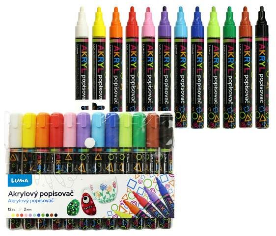 Akrylové popisovače- 12 barev v balení- hrot 2mm- 5g inkoustu v popisovači- vhodné na různé povrchy (papír vyšší gramáže, kameny, plátno, dřevěné desky, ...)