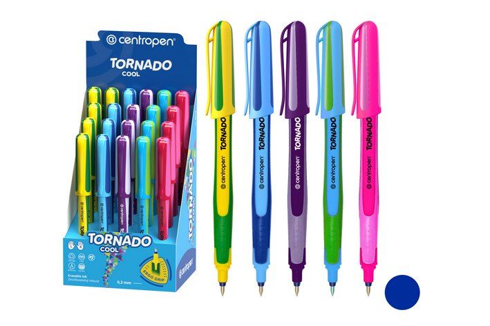 Školní roller nové generace v atraktivním designu. Protiskluzová ergo úchopová část s masážními body, které při psaní aktivují tzv. prstové receptory a tím garantují zdravé psaní bez únavy. Jako plnohodnotná náhrada plnicích per je vhodný pro praváky, leváky i dysgrafiky. Píše lehce bez tlačení, doporučeno pro první dětské psaní. Velmi dlouhá a tenká stopa písma, která se na kvalitním papíře nepropíjí, nerozpíjí ani nekaňká. Zcela nový, zdravotně nezávadný, rychleschnoucí, zmizíkovatelný inkoust. Mix barev Barva inkoustu: sytě modráŠíře stopy: 0,3mm Hrot: roller
