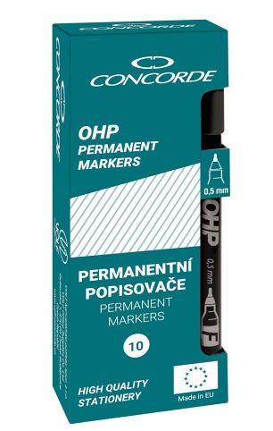 Popisovač OHP M naplněný permanentním inkoustem na bázi lihu, který je vhodný pro popis průsvitných folií, skla, umělé hmoty, dřeva a kovu. Neprůhledný inkoust. Nesmazatelný a voděodolný. Šíře stopy 1-1,5mm (M).