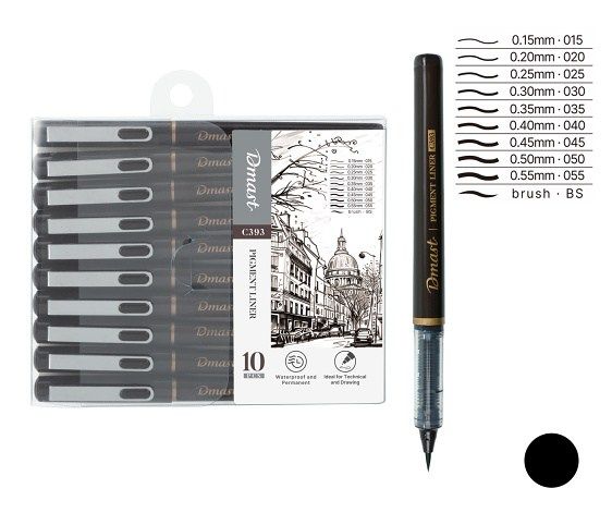 Kovový hrot- voděodolný a permanentní inkoust- barva není náchylná k prosakování papírem, nedochází k rozmazávání- pružný kovový klip na pero- ideální pro technické účely a kreslení- barva: černá- hrot: 0.15, 0.20, 0.25, 0.30, 0.35, 0.40, .45, 0.50, 0.55 + štětec B5UPOZORNĚNÍ:Není hračka. Doporučujeme dohled dospělé osoby. Nevkládat hrot do úst, hrozí nebezpečí požití tekutiny. Udržujte mimo dosah očí a tváře.