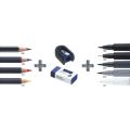 Sada moderních popisovačů s různými hroty pro tušové skicování, kreslení a malbu včetně pastelek a příslušenství.