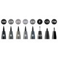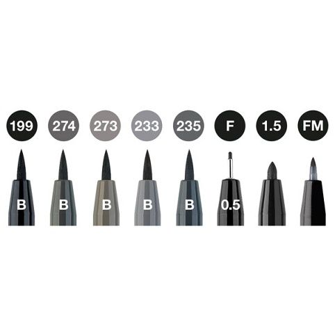 Moderní umělecký popisovač Faber-Castell Pitt Artist Pen pro tušové skicování, kreslení a malbu. Odstíny šedé a černé. Hrot B, hrot F (0,5 mm), hrot 1,5 mm, hrot FM,