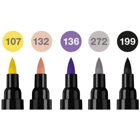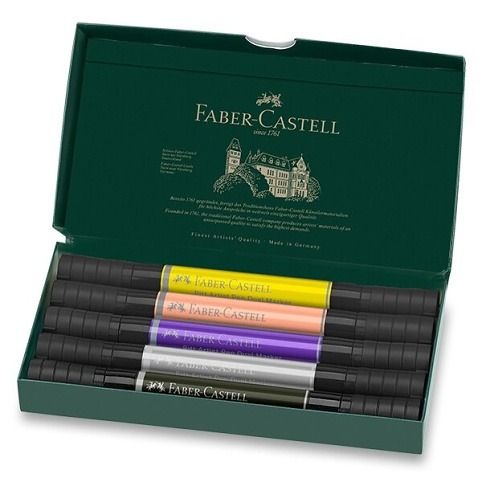 Sada 5 ks moderního uměleckého oboustranného popisovačeFaber-Castell Pitt Artist Pen Dual Marker pro tušové skicování, kreslení a malbu. Popisovač má měkký štětec pro uměleckou práci a tenký hrot v kovovém pouzdře pro jemné linky kontur a detailů. Změnou úhlové polohy a změnou tlaku je možné vytvořit různé šířky čar. Šíře stopy hrotu 0,8 mm.