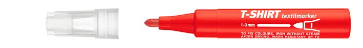 Červený popisovač na textil s kulatým hrotem. Šíře stopy 1-3 mm. Pro fixaci barev je nutné zažehlení (bez páry). Je vhodný pro popisování téměř všech druhů textilních materiálů, odolný proti praní.