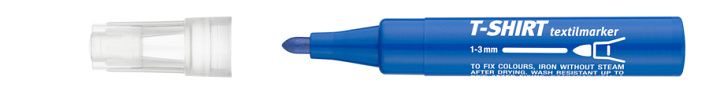 Modrý popisovač na textil s kulatým hrotem. Šíře stopy 1-3 mm. Pro fixaci barev je nutné zažehlení (bez páry). Je vhodný pro popisování téměř všech druhů textilních materiálů, odolný proti praní.