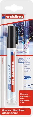 Popisovač na všechny skleněné povrchy. Vynikající krycí schopnost - zářivé barvy zajistí, že je stopa i na barevném skle dobře viditelná, inkoust je rychleschnoucí a nezanechává žádný mastný film. Popisovač využijete na sklo, skleněné tabule, zrcadla i na bílé tabule. Praktickou vlastností je smazatelnost stopy zasucha - není nutné používat vlhký hadr. Popisovač je ihned použitelný - stačí sejmout víčko a psát. Kulatý hrot. Šíře hrotu 1,5-3 mm.
