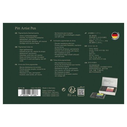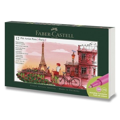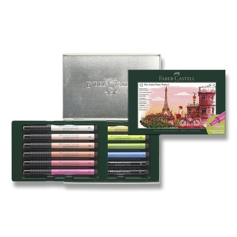 Sada 12 kusů moderních uměleckých popisovačů Faber-Castell Pitt Artist Pen Brush s pružným štětečkovým hrotem, který je ideální pro tušové skicování, kreslení i malbu. Obsahuje odstíny inspirované barvami charakteristickými pro Paříž.