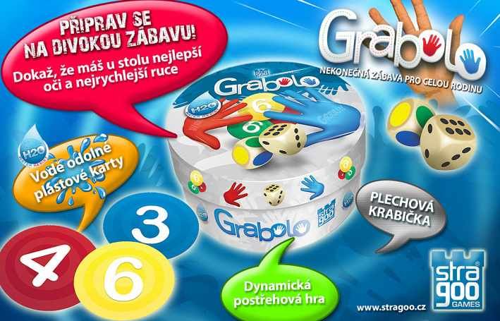 Dokaž, že máš u stolu nejlepší oči a nejrychlejší ruce. Kostky určí kombinaci barvy a čísla a tvá ruka se musí co nejdříve dostat na správnou kartu. Divoká přestřelka rukou nad stolem a nekonečná zábava. Grabolo nezklame na párty ani při rodinné hře. Grabolo – divoká zábava pro všechny. Hra obsahuje 36 plastových voděodolných karet a 2 dřevěné kostky.
