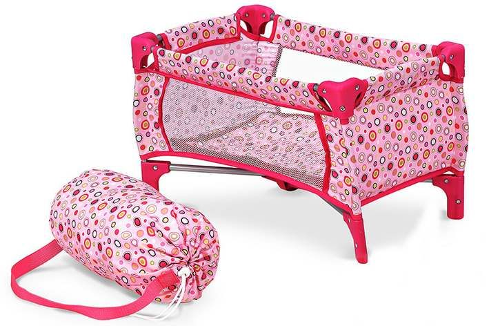 Cestovní postýlka je určená pro panenky do velikosti 46 cm. Je laděná do růžové barvy, zdobená puntíky.