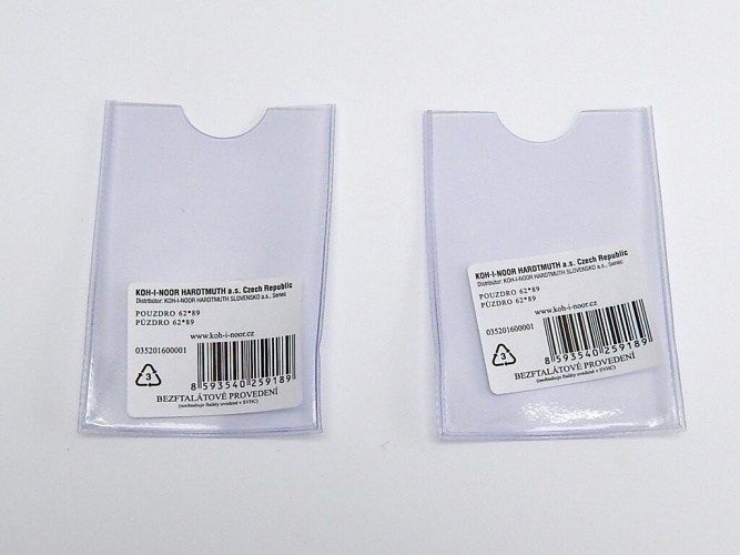 Transparentní pouzdro z BEZFTALÁTOVÉHO materiálu otevřené v horní části s palcovým výsekem. Je určeno k úschově platebních, slevových karet či dokladů, průkazů do formátu karty a slouží k jejich ochraně proti poškození. Vyznačuje se vysokou pevností svárů a jejich odolností proti roztržení. Pouzdro je jednotlivě značeno etiketou s EAN kódem.