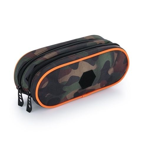 Školní pouzdro etue v maskáčovém provedení. Pouzdro je opatřeno dvěma oddělenými kapsami s pevnými zipy. Vhodné pro školáky na 2. stupni a starší studenty.