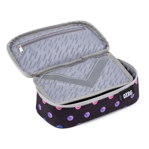 Školní pouzdro etue OXY Jumbo v puntíkovaném provedení. Školní pouzdro je opatřeno pevnými zipy, uzavíratelnou kapsičkou na zip, přihrádkou na pravítko a klopou s šesti poutky na psací potřeby. Pod klopou je místo pro volné uložení psacích potřeb nebo jiných drobností. Vhodné pro školáky na 2. stupni a starší studenty.