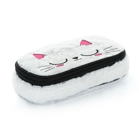 Plyšové školní pouzdro etue je opatřeno pevnými zipy, kapsičkou na zip a klopou s pevnými poutky po obou stranách. Pod klopou je místo pro volné uložení psacích potřeb nebo jiných drobností.