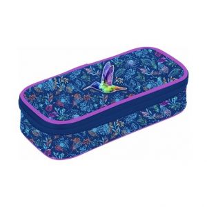 Školní pouzdro etue s motivem kolibříka. Pouzdro je opatřeno pevnými zipy, kapsičkou na zip a klopou s pevnými poutky po obou stranách. Pod klopou je místo pro volné uložení psacích potřeb nebo jiných drobností. Vhodné pro školáky na 2. stupni a starší studenty.