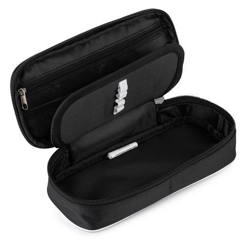 Školní pouzdro etue OXY v černo-bílém provedení. Pouzdro je opatřeno pevnými zipy, kapsičkou na zip a klopou s pevnými poutky po obou stranách. Pod klopou je místo pro volné uložení psacích potřeb nebo jiných drobností. Vhodné pro školáky na 2. stupni a starší studenty.
