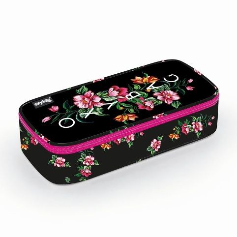 Školní pouzdro etue OXY v květinkovém provedení. Pouzdro je opatřeno pevnými zipy, kapsičkou na zip a klopou s pevnými poutky po obou stranách. Pod klopou je místo pro volné uložení psacích potřeb nebo jiných drobností. Vhodné pro školáky na 2. stupni a starší studenty.