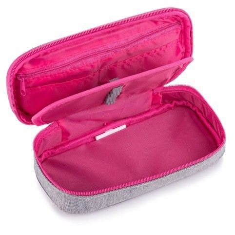 Školní pouzdro etue OXY v šedorůžovém provedení. Pouzdro je opatřeno pevnými zipy, kapsičkou na zip a klopou s pevnými poutky po obou stranách. Pod klopou je místo pro volné uložení psacích potřeb nebo jiných drobností. Vhodné pro školáky na 2. stupni a starší studenty.
