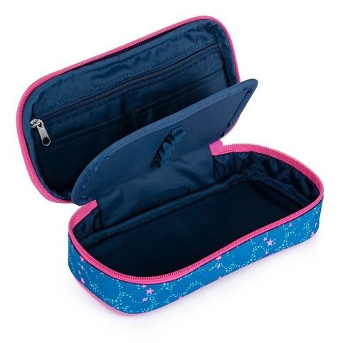 Školní pouzdro etue s motivem jednorožce. Pouzdro je opatřeno pevnými zipy, kapsičkou na zip a klopou s pevnými poutky po obou stranách. Pod klopou je místo pro volné uložení psacích potřeb nebo jiných drobností.