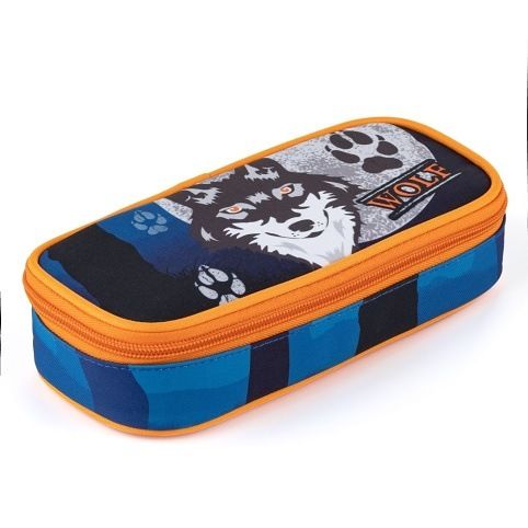 Školní pouzdro etue s motivem vlka. Pouzdro je opatřeno pevnými zipy, kapsičkou na zip a klopou s pevnými poutky po obou stranách. Pod klopou je místo pro volné uložení psacích potřeb nebo jiných drobností. Vhodné pro školáky na 2. stupni a starší studenty.