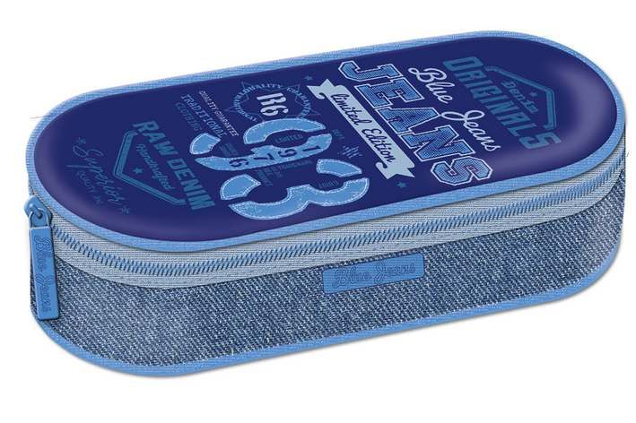 Praktický a prostorný oválný penál Blue jeans. Je vybaven vnitřní kapsou na zip a rozvrhem hodin, který je vložen pod fólií na klopě. Ta odděluje horní část penálu a má na sobě gumičky pro uchycení potřeb na psaní. Každý zip je ukončen ozdobou.