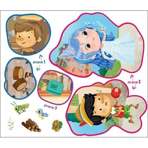 Interaktivní samolepková knížka obsahuje 12 stran pohádkového příběhu a více než 30 samolepek. Děti dolepují správné samolepky a pomáhají tvořit pohádkový příběh.