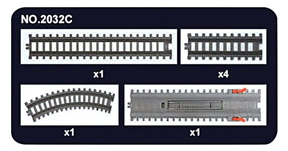 1× rovná, dlouhá kolej, 4× rovná, krátká kolej, 1× zatáčka, 1× kolej