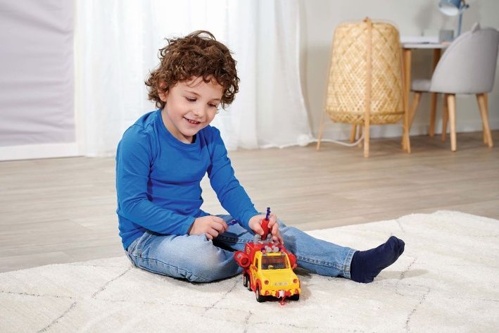 Hasičské auto se zvukem, stříkačkou, otevírací dveře. Figurka Penny součástí a další příslušenství. Délka auta 19 cm.