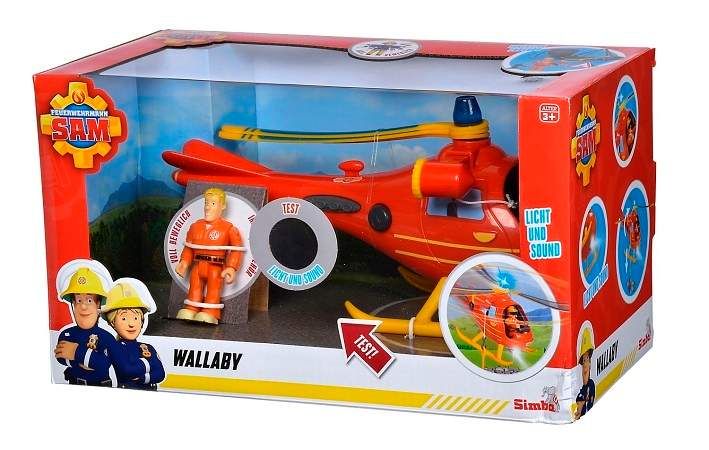 Vrtulník s figurkou Toma z oblíbeného seriálu Požárník Sam. Modrý světelný efekt, světlomet a zvukový efekt. Otočná vrtule, mechanický naviják a příslušenství. Délka 15 cm