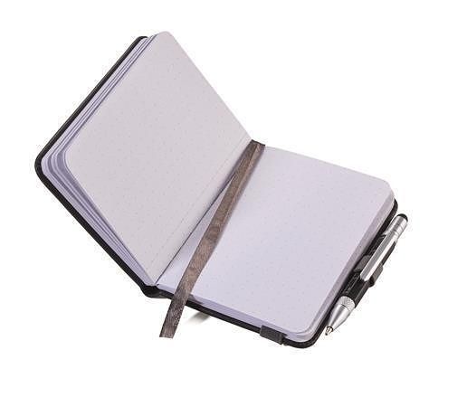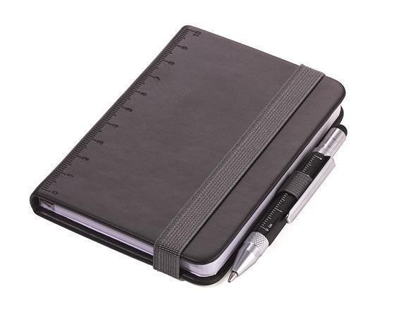 Praktický poznámkový blok s kuličkovým perem a elastickým uzavíráním, díky kterému drží všechny poznámky pohromadě. Certifikovaný papír FSC Vlastnosti: perforované strany praktickou mřížkou; vnitřní papírová kapsa; reliéfní pravítko 10 cm; pero Liliput s pravítkem, šroubovákem a stylusem; Formát: A7 Počet stran: 128 Náplň pera: černá Barva: černá Materiál: umělá kůže a kov Hmotnost: 0.08 kg Rozměry: 12x85x101 mm (VxŠxD)