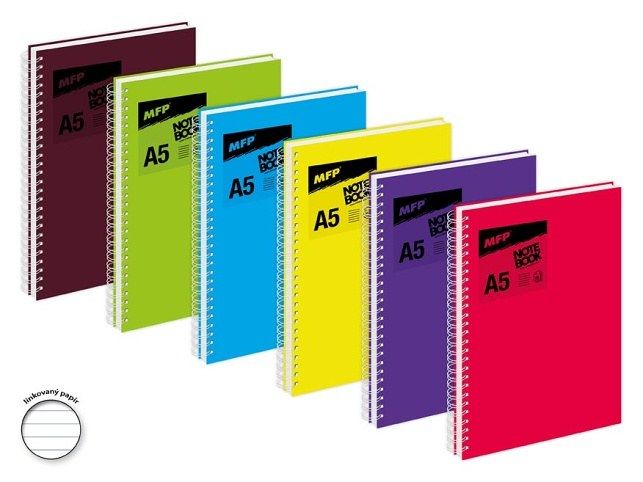 Linkovaný poznámkový blok A5 se spirálou, desky bloku jsou vyrobeny z PVC. Zápisník je v barvách oranžová, zelená, modrá, žlutá, fialová, růžová.