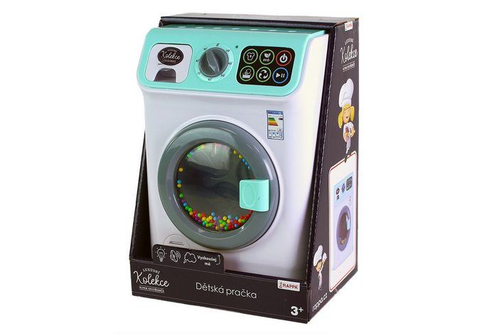 Pračka o rozměrech 17,5 x 24 x 14 cm je vyrobena z kvalitního PVC a vyžaduje 3 ks baterií typu AA, které jsou součástí balení. Tato hračka je z kolekce luxusních dětských spotřebičů a je určena pro děti od 3 let. Baleno v krabici.
