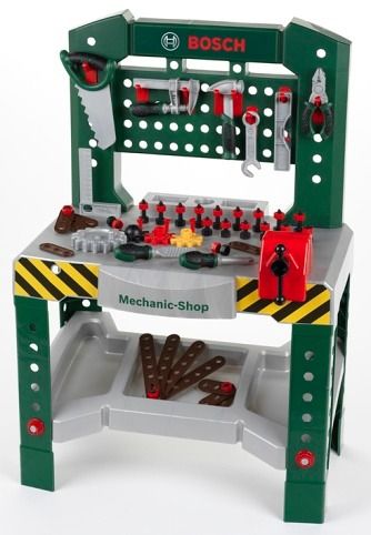 Pracovní stůl Bosch. Spoustu nářadí, se kterým může maly opravář všechno opravit. Pracovní stůl má celkem 77 součástek na hraní. Stolek ma rozměry 86x57 cm. Vhodné pro děti od 3+. Baleno v krabici.