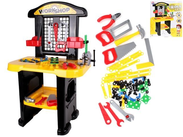 Dětský pracovní stůl s nářadím je ideální pro všechny kutily. Děti si na něm mohou řezat, šroubovat či zatloukat kladivem. Ve výbavě najdete svěrák, kladivo, klíče, pilu, šroubky, matičky a další. Pracovní stůl je o velikosti 74x46x29 cm. Sada obsahuje 61ks nářadí. Vhodné pro děti od 3 let.