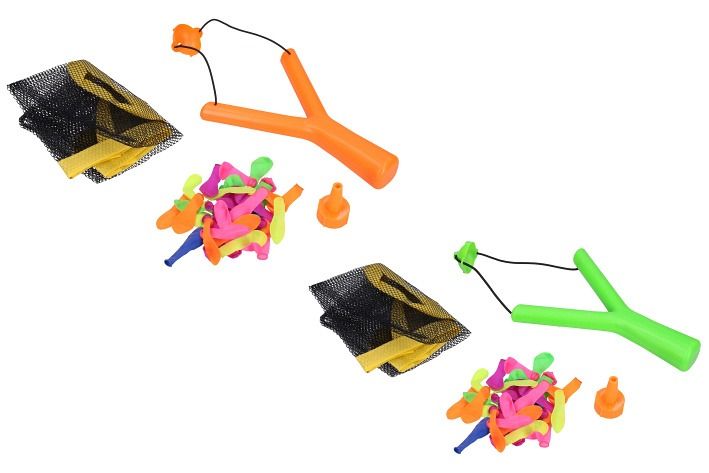 Prak s vodními bombami. Velikost praku 19 cm. Obsahuje prak, 36 balonků, síťovaný pytlík. 2 varianty - zelená, oranžová.