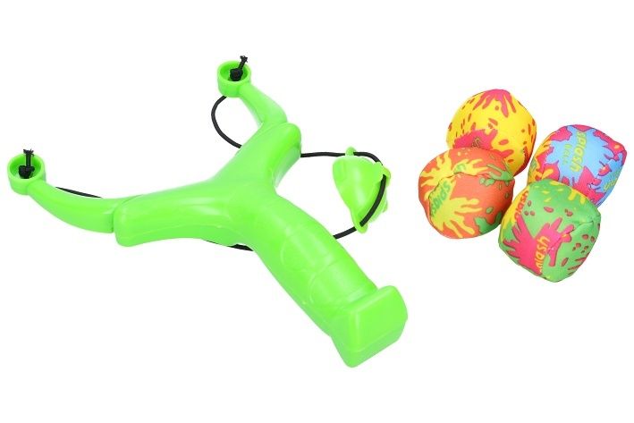 Prak s vodními bombami. Velikost praku 21 cm. Obsahuje prak, 4 vodní bomby.