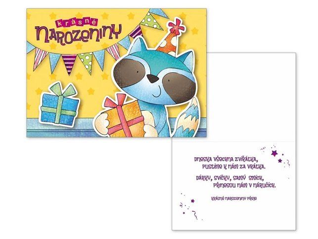 Dětské přání s obrázkem klauna a balónků. Toto přání obsahuje text. Text na přední straně přání: krásné narozeniny Text uvnitř přání: Dneska všechna zvířátka, pustíme k nám za vrátka. Dárky, svíčky, samý smích, přinesou nám náručích. Krásné narozeniny přeje Papír: pohlednicový karton 300 g Přání je baleno v sáčku, součástí balení je i dopisní obálka Přání je na obale označené doporučenou prodejní cenou.