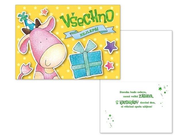 Dětské přání s obrázkem dárků. Toto přání obsahuje text. Text na přední straně přání: Všechno nejlepší Text uvnitř přání: Dneska bude oslava, samá velká zábava. S kamarády dnešní den, si všichni spolu užijem! Papír: pohlednicový karton 300 g Přání je baleno v sáčku, součástí balení je i dopisní obálka Přání je na obale označené doporučenou prodejní cenou.