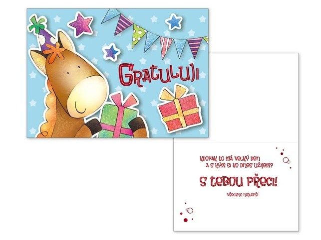 Veselé dětské přání s textem a obrázkem koníka Text na přední straně přání: Gratuluji Text uvnitř přání: Kdopak to má velký den, a s kým si ho dnes užijem? S tebou přeci! Všechno nejlepší Papír: pohlednicový karton 300 g Přání je baleno v sáčku, součástí balení je i dopisní obálka Přání je na obale označené doporučenou prodejní cenou.