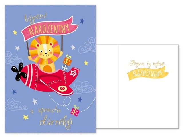 Veselé dětské přání s textem a obrázkem lva Text na přední straně přání: Báječné narozeniny a spoustu dárečků. Text uvnitř přání: Přejeme ty nejlepší narozeniny Papír: pohlednicový karton 300 g Přání je baleno v sáčku, součástí balení je i dopisní obálka Přání je na obale označené doporučenou prodejní cenou.